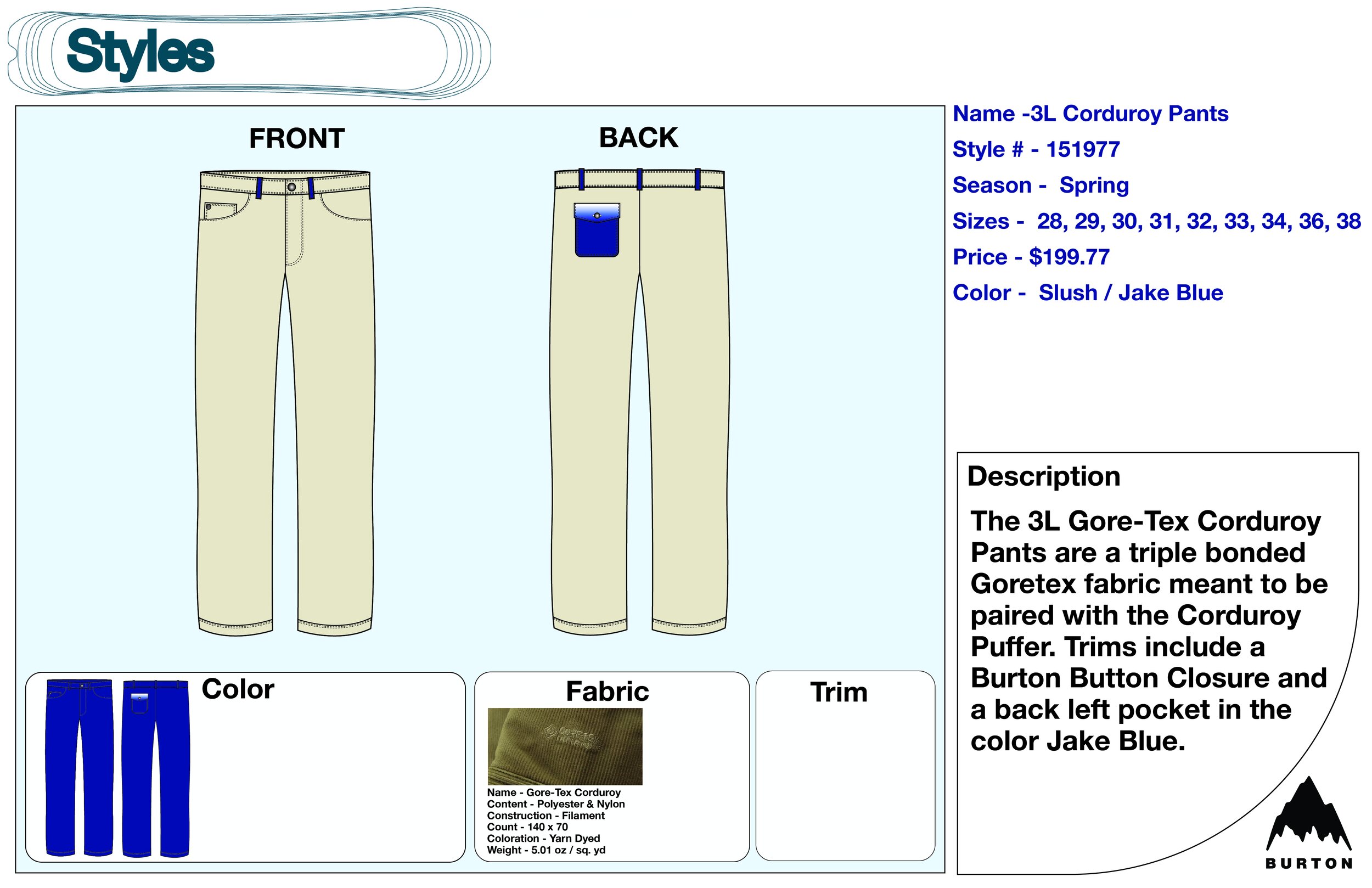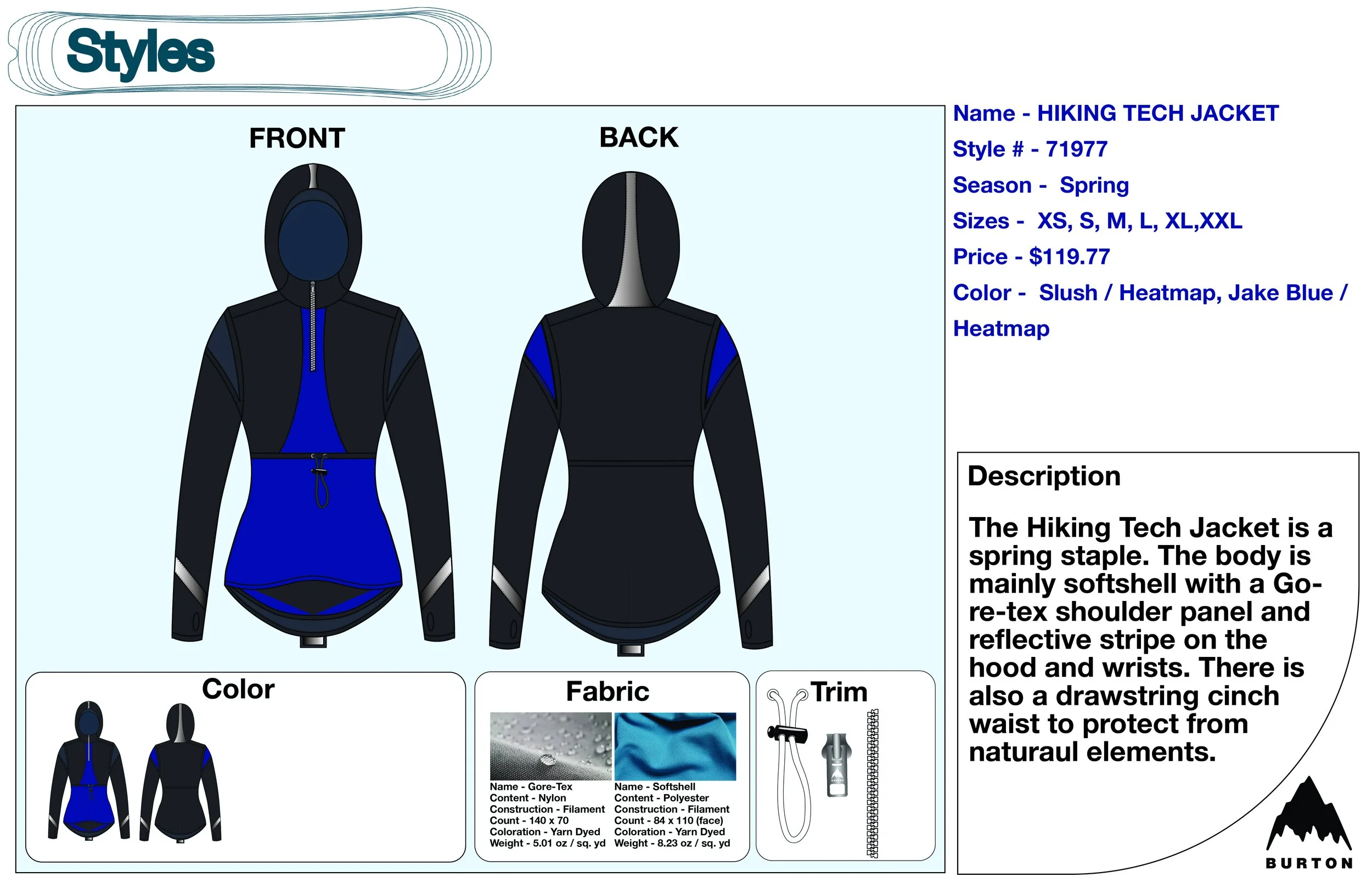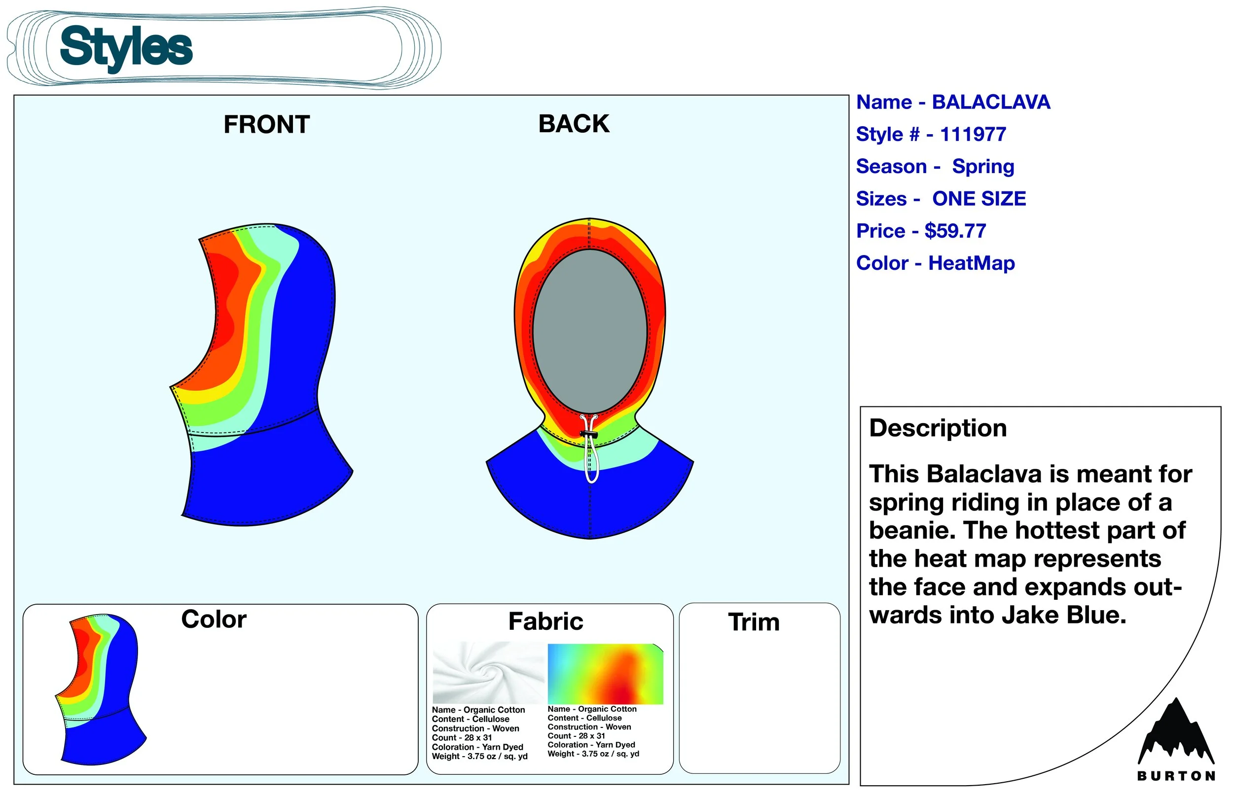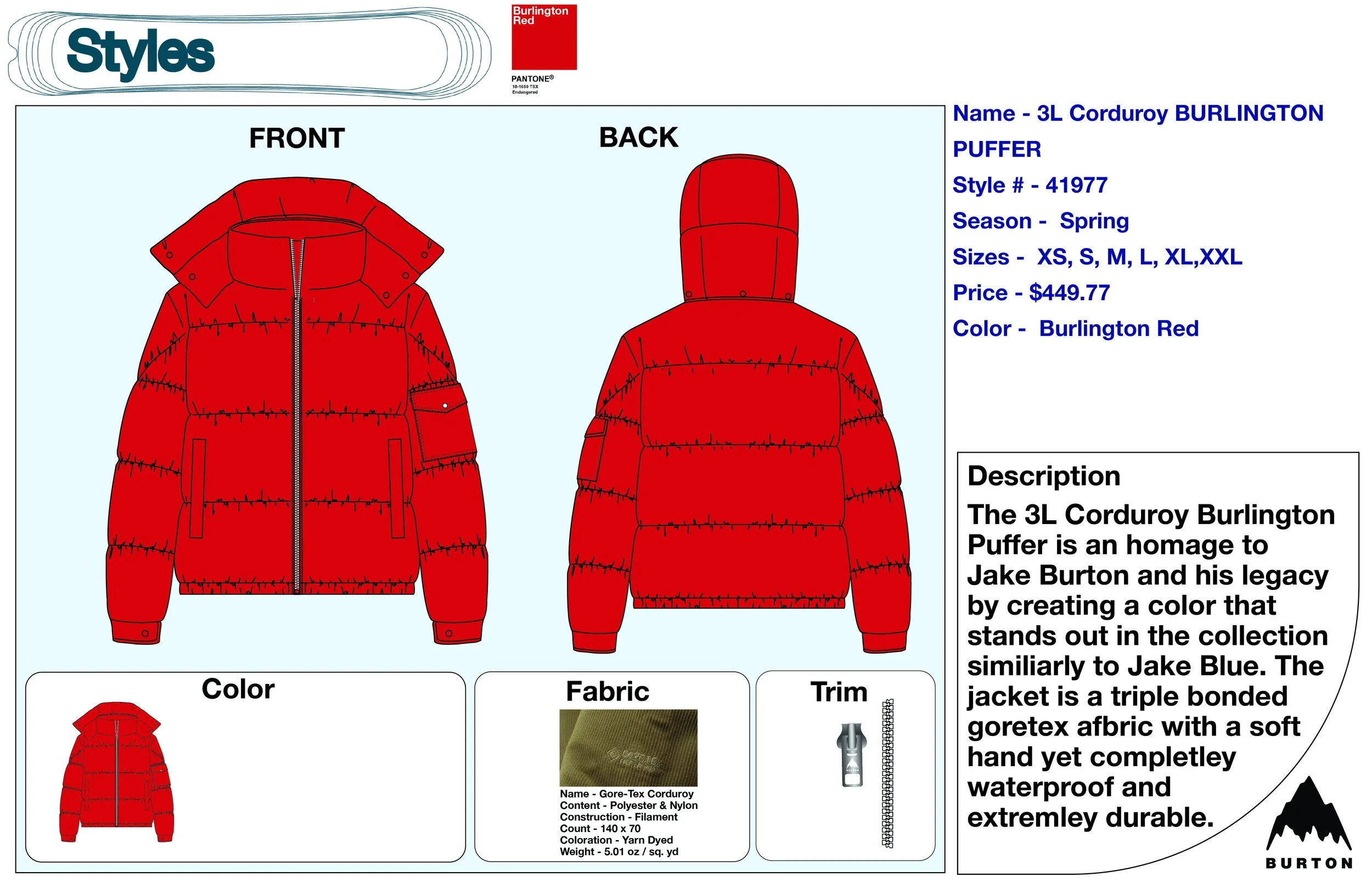 I began working for Burton Snowboards at their flagship location in Santa Monica, CA, in 2020. I applied only knowing that I was infatuated with snowboarding, and I loved outdoor apparel and product development. At the time, I was also enrolled at FIDM. A majority of my assignments were shaped and inspired by my involvement with Burton.